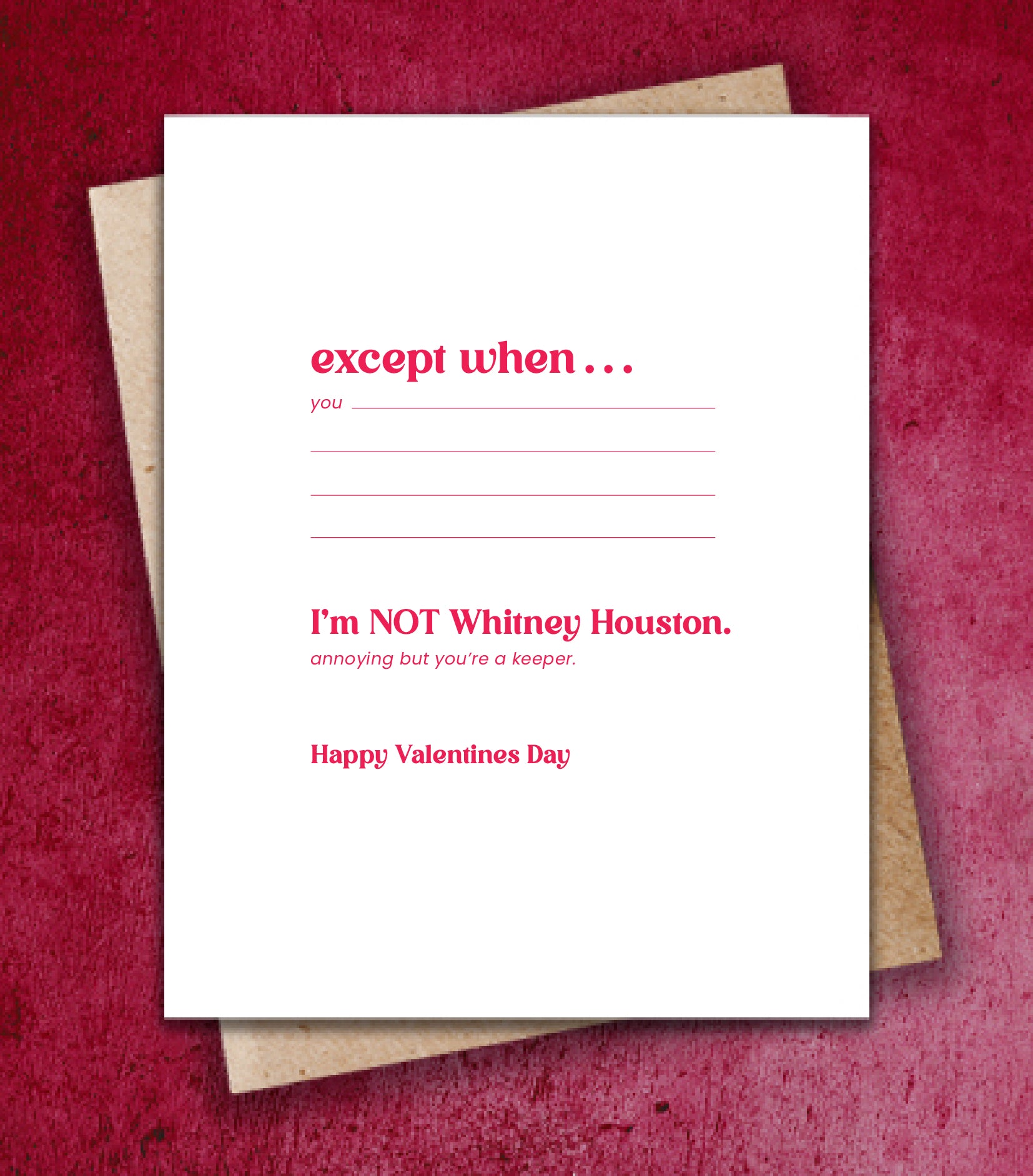 "I will always love you ... expect when you. I'm NOT Whitney Houston. Annoying but you're a keeper. Happy Valentine's Day"