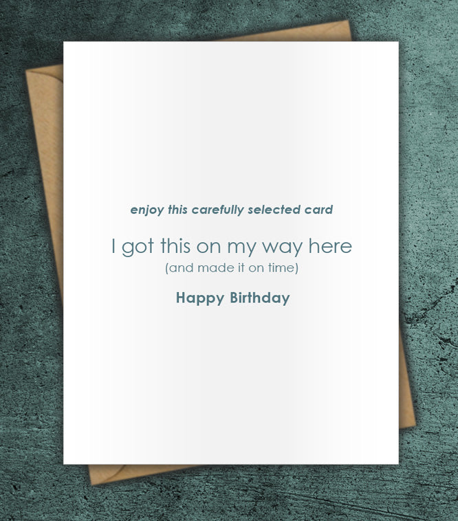 "enjoy this carefully selected card. got this on my way here (and made it on time). Happy Birthday."