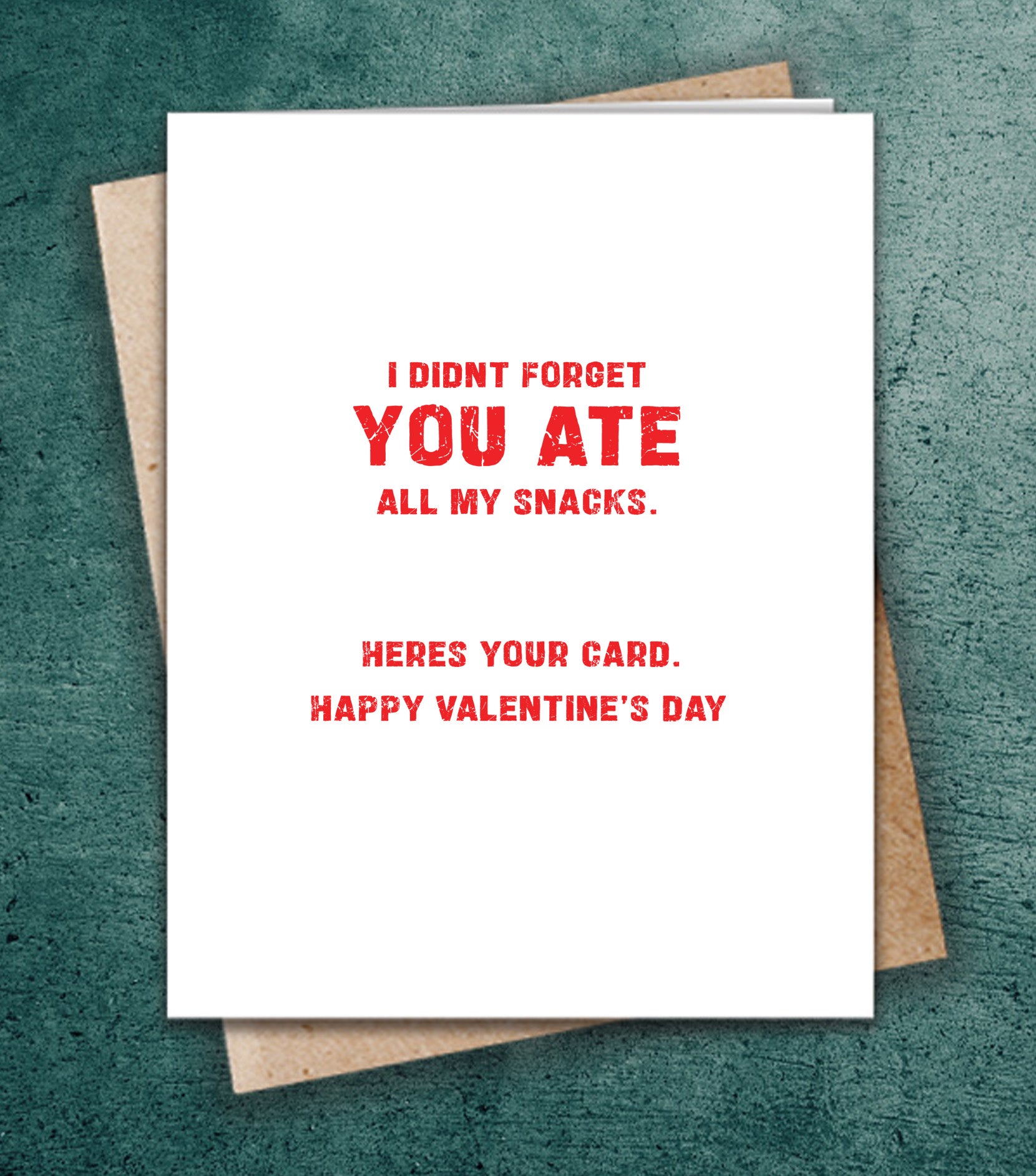 "I didn't forget you ate my snacks. Here's your card. Happy Valentine's Day.